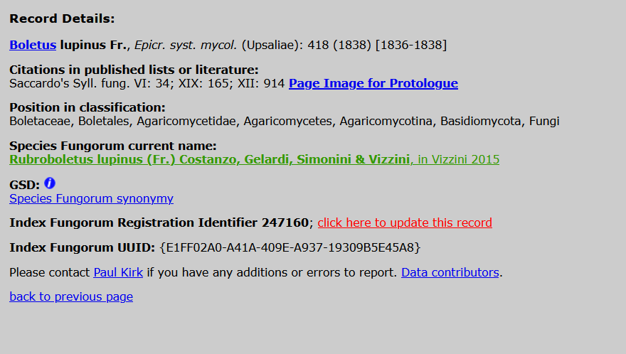 29 avr. 2020, 19:20Nommo a écrit : Jean-Pierre, comment accèdes-tu à la description sur IF ?Il faut d'abord repérer le basionyme, par exemple pour Macrolepiota procera, c'est Agaricus procerus Scop. 1772, puis il faut se rendre sur la fiche du basionyme et avec un peu de chance il y a un lien vers Page Image for Protologue.