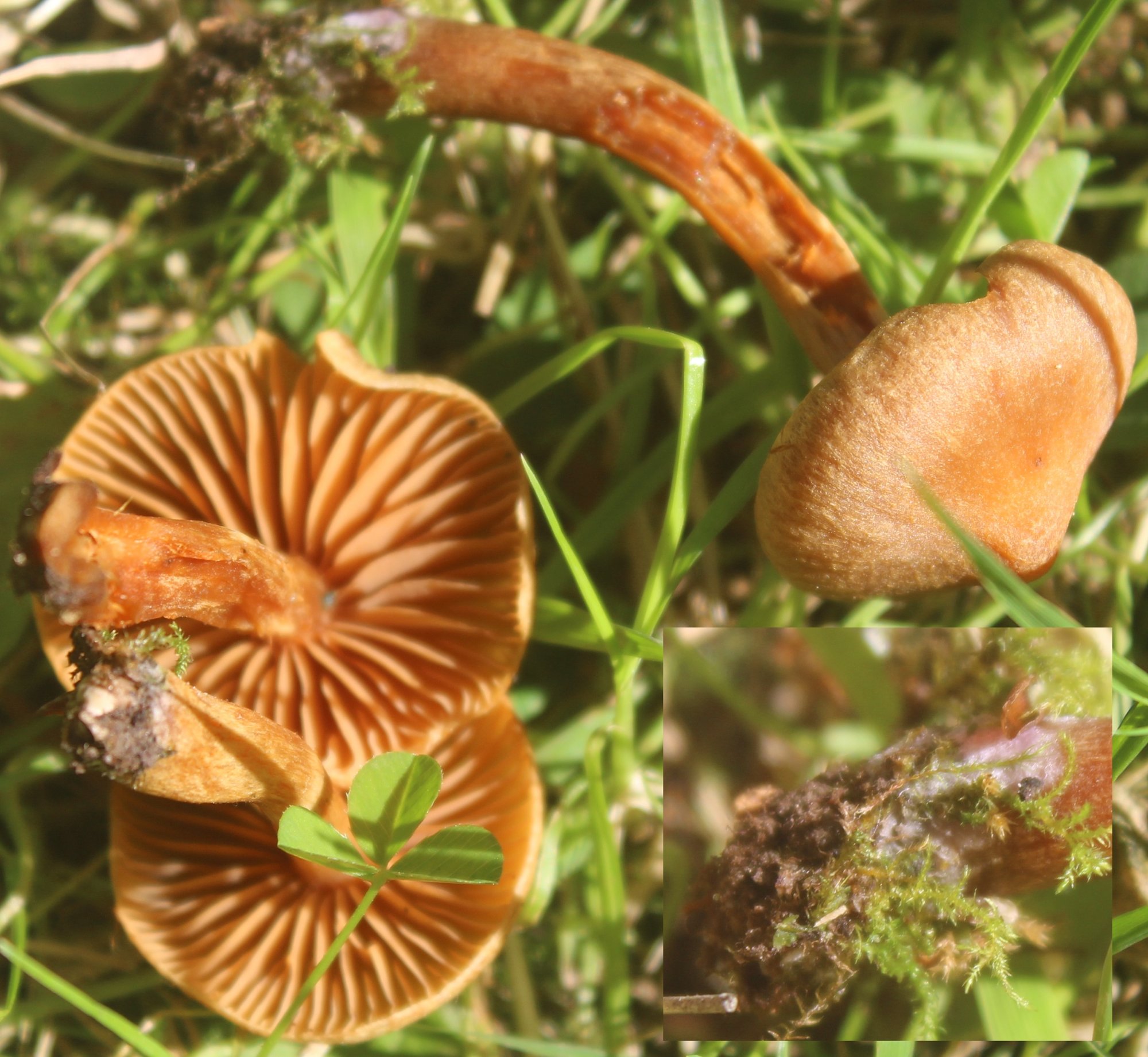 Avec son allure d'Hinnulei, son voile teinté de jaune, son mycélium basal rose et son mamelon peu marqué, je verrais bien Cortinarius basililaceus