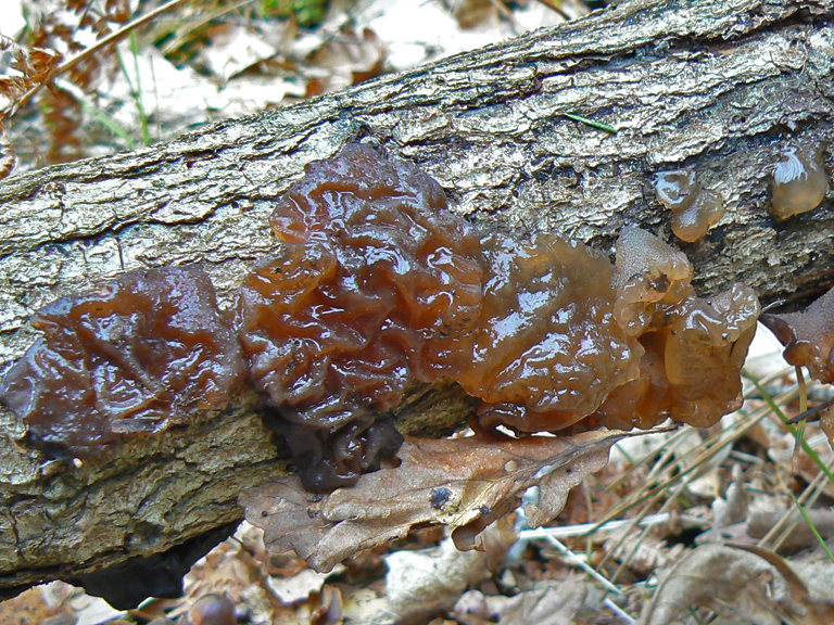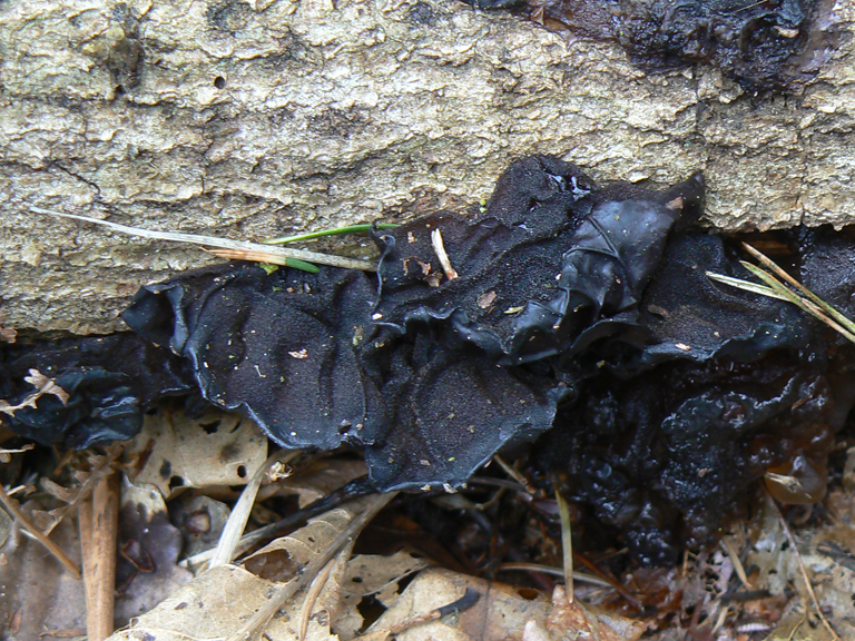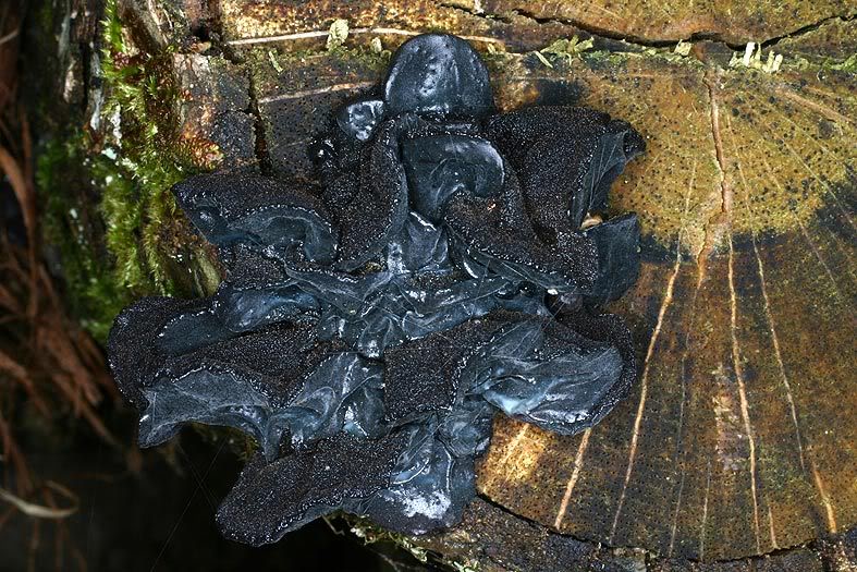 Tout d'abord, je suis sûr (disons à 90%) qu'il s'agit de la même espèce. Encore une fois, certains carpophores présentent la forme noire, apparemment plus sèche, et la forme brune translucide et gélatineuse. On distingue sur la première photo, l'exemplaire en second plan, en l'observant de gauche à droite la forme va du noir, plus sec, à brun plus gélatineux.