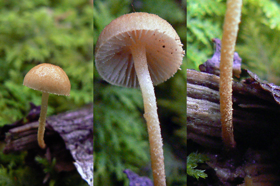 Chapeau d'environ 1 cm, garni de petites méchules visibles surtout à la loupe. Pied aussi garni de méchules sur toute sa hauteur, blanchâtre en haut à brun roux plus sombre à la base.