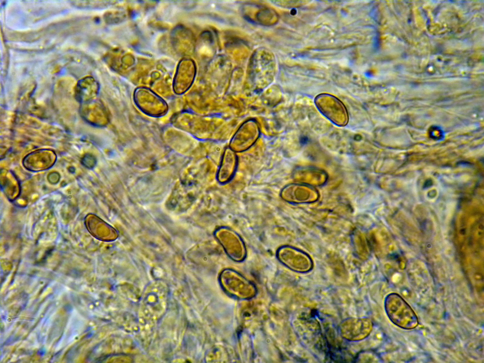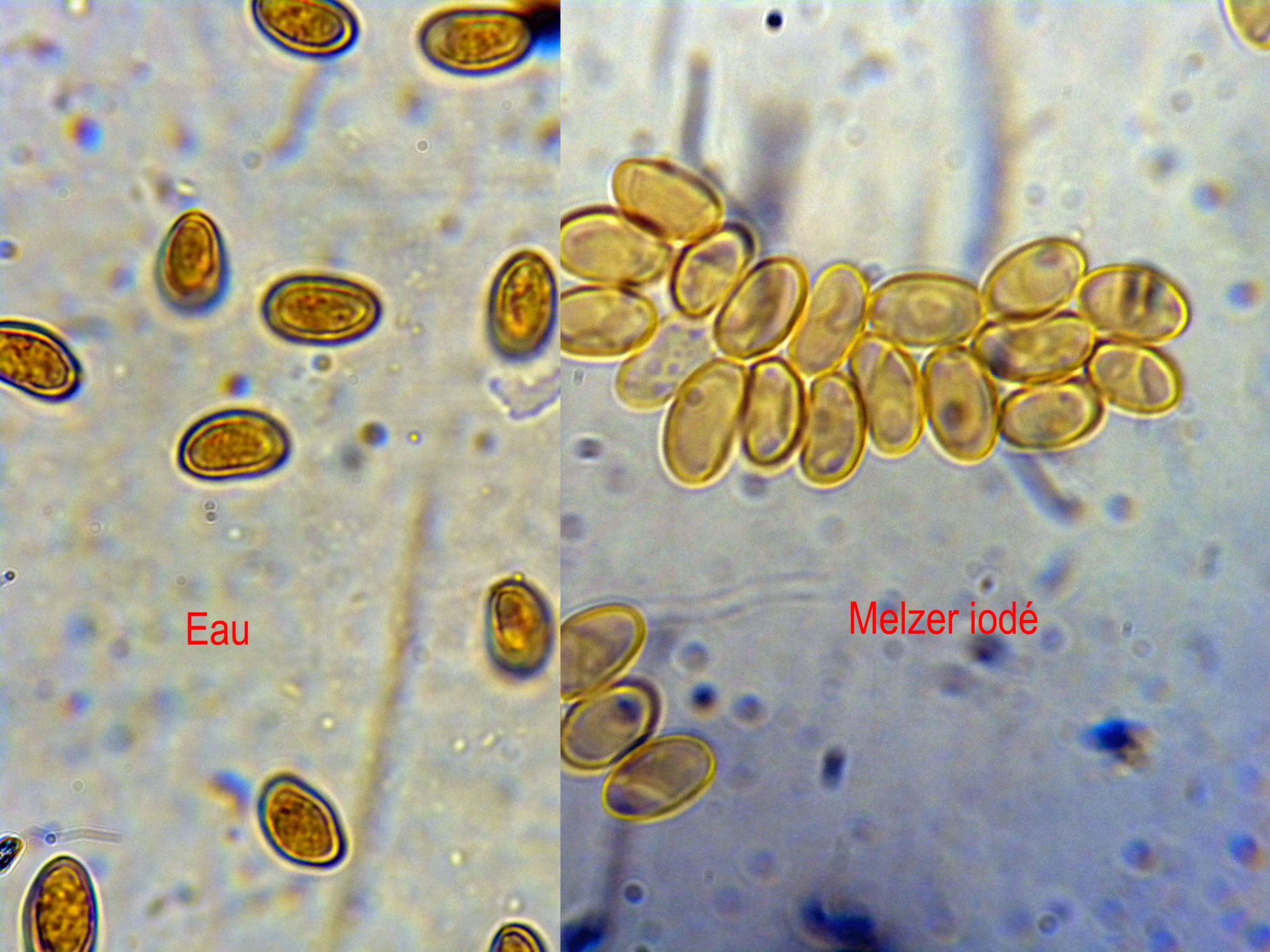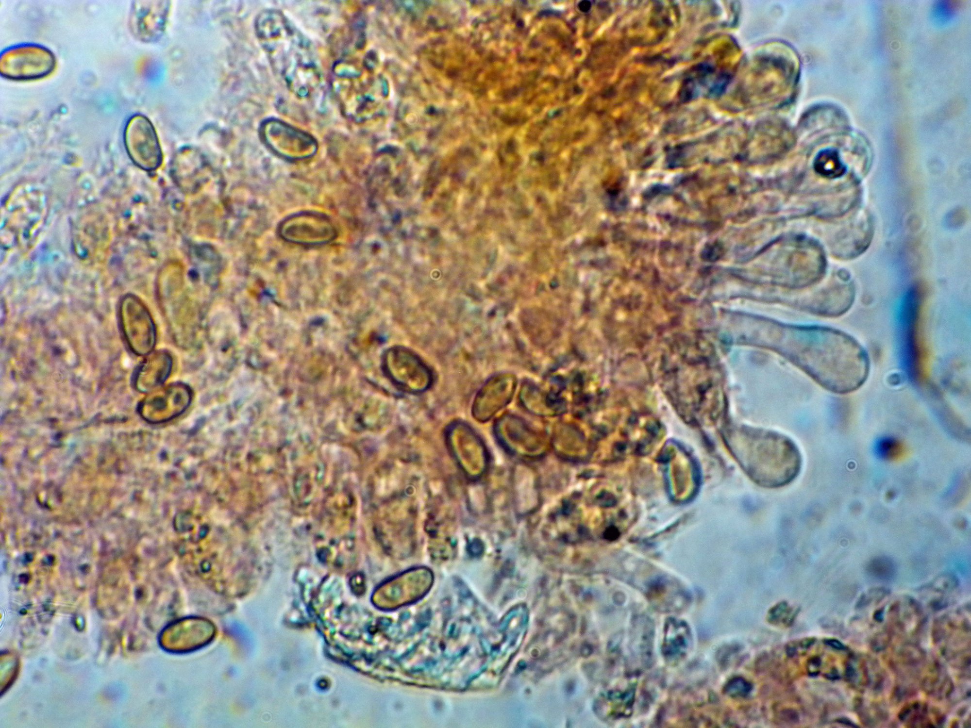 Chapeau dia 30 mm, pied courbé dia 3 mm h 25 mm solidement encré dans l'écorce. Spores bruns 7-4,5µm qui se dispersent sur tous le champignon.