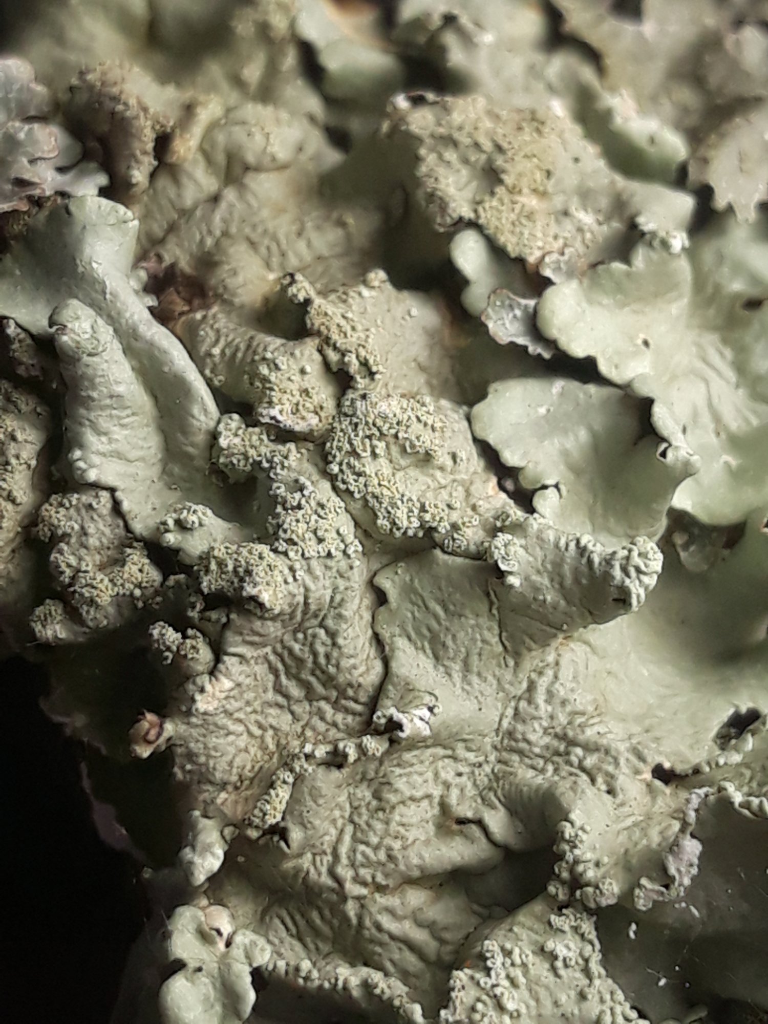 Parce que ce spécimen, avec sa texture un peu plissée comme du vieux cuir et ses soralies qui donnent un aspect "sale" aux parties les plus âgées du thalle, ressemble énormément à Flavoparmelia caperata ou F. soredians.
