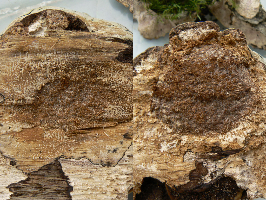 La forme (en sabot, du moins sur sur une des photos) du champignon, la couleur générale,le noyau mycélien,le géotropisme fréquent chez cette espèce (? ) et la forme des pores moins anguleuse pour ne pas dire ronde, me font pencher nettement vers Fomes fomentarius.
