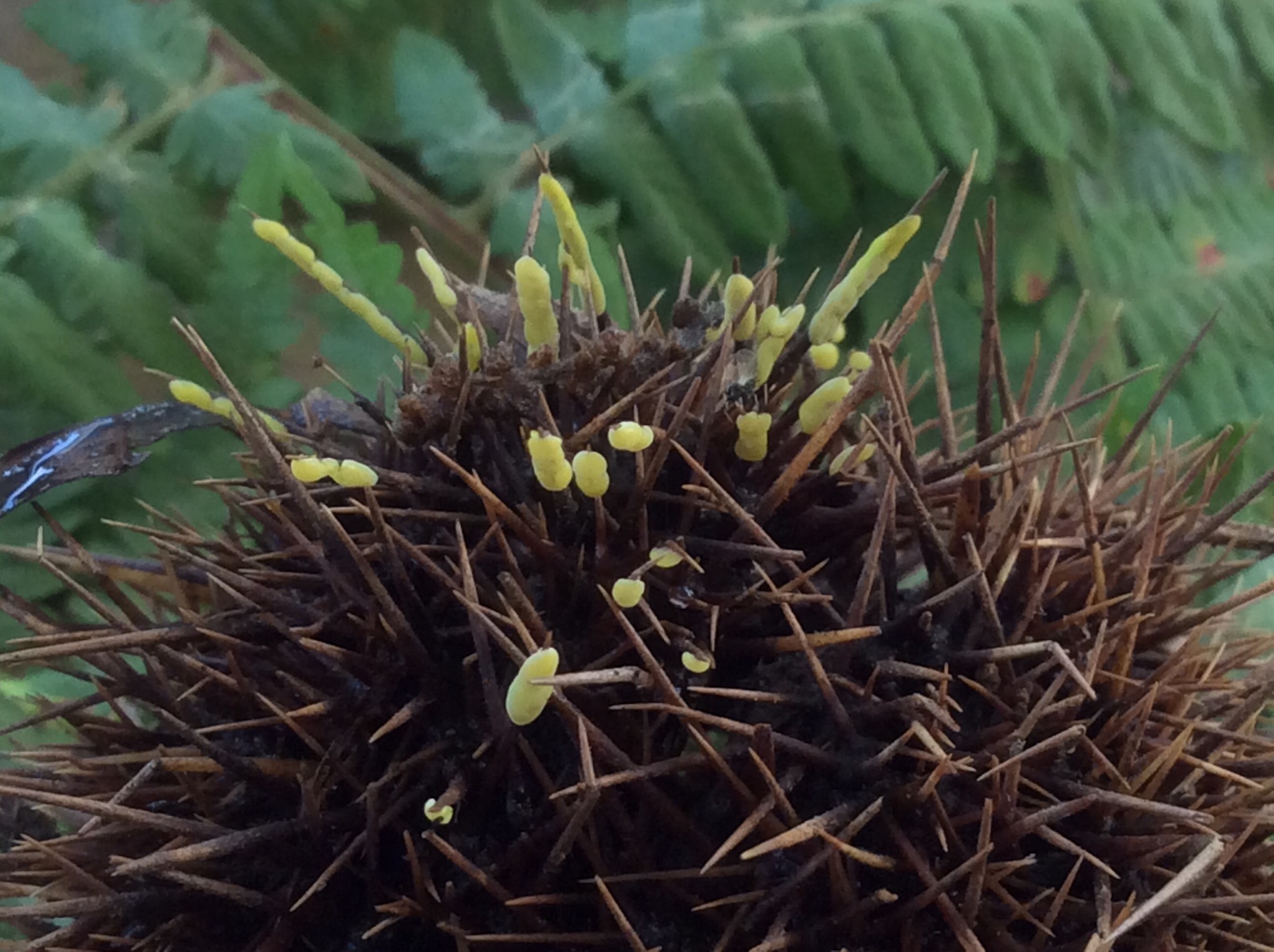 En googlant quoi ? Truc jaune sur bogue ? Google ne peut travailler qu'avec des mots-clés. J'ai tenté "Myxomycète boque", j'ai eu des sites qui parlaient de myxos et de bogues mais pas de myxos sur bogues. Si tant est que ce soit un myxo, pure hypothèse.