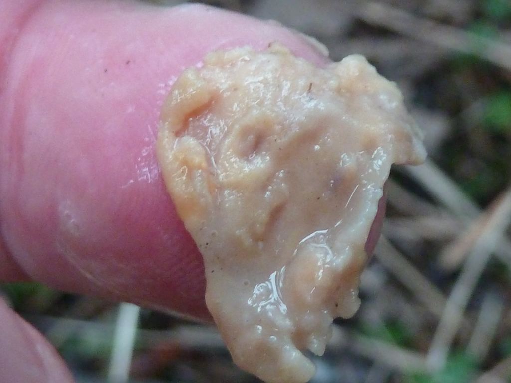 J'ai pris en main un des petits, semblant "plus avancés" que le spécimen le plus gros. Sans doute à cause de la pluie récente il y avait une goutte d'eau pendante dessous, et son touché était assez visqueux / gluant. Avec une certaines résistance sous les doigts, surtout semble-t-il sur l'"enveloppe extérieure" (qui semblait être une couche plus résistante, mais pas facile de distinguer la constitution, entre l'état de maturité et l'humidité...). Un peu caoutchouteux.