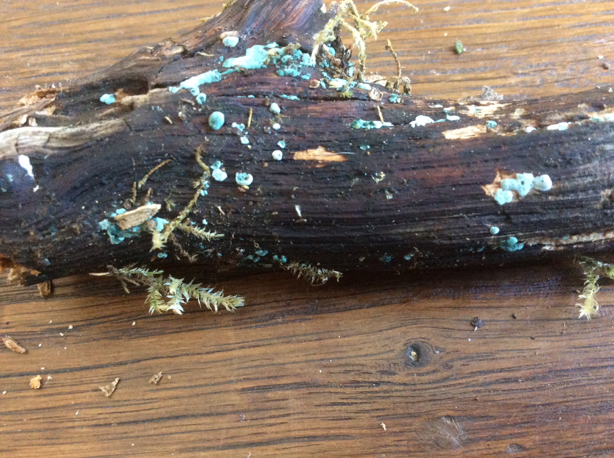 Rien trouvé, pris sur le terrain, de loin, pour une espèce du genre Chlorociboria. L’aspect pulviné m’a écarté du genre.