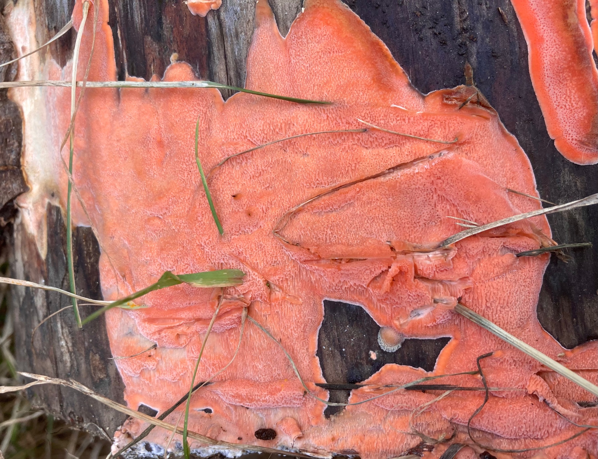 Bonjour, j'ai trouvé ce corticié coloré à hyménophore à priori méruloïde sur des buches coupée (je ne sais pas de quoi, je vous joins les photos des buches), à noter que la véritable couleur tire bien plus sur le rose vif que sur le saumon. Quelque chose dans le style de Gloeoporus taxicola ?