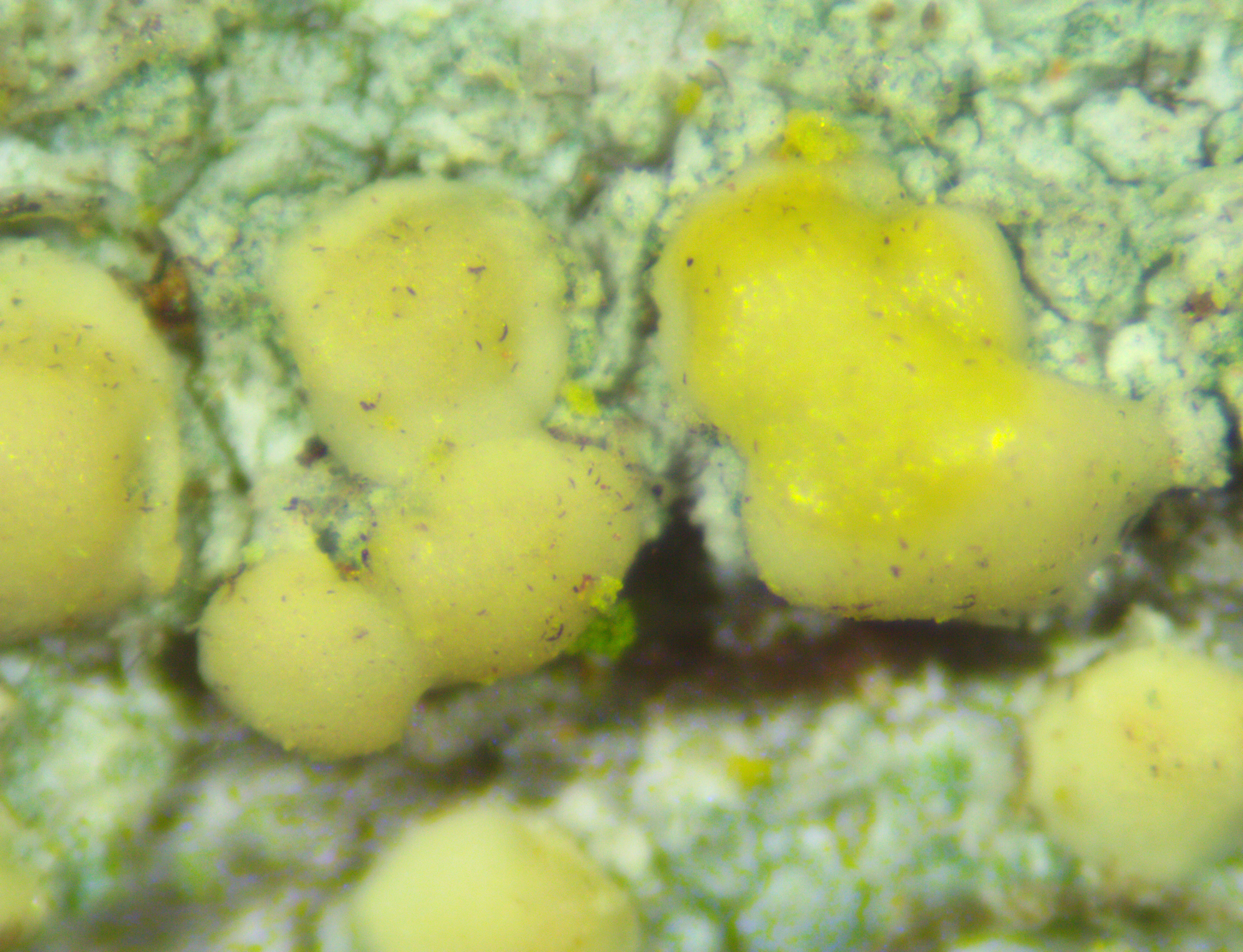 "Si tu as du lugol iode pour colorer les spores, ça pourrait aider. Tu peux colorer légèrement genre 1 goutte lugol dans 4 gouttes d'eau puis tu prends 1 goutte du mélange pour mettre sous la lamelle. Un élément clé sera de voir les spores. Je ne connais pas bien les espèces européennes. Je regarderai dans le British lichen flora. Les lichens crustacés à apothécie jaune sont à part dans les clés. Si la spore est bien à 4 ou 5 espaces, ce sera je l'espère, plus facile à identifier."