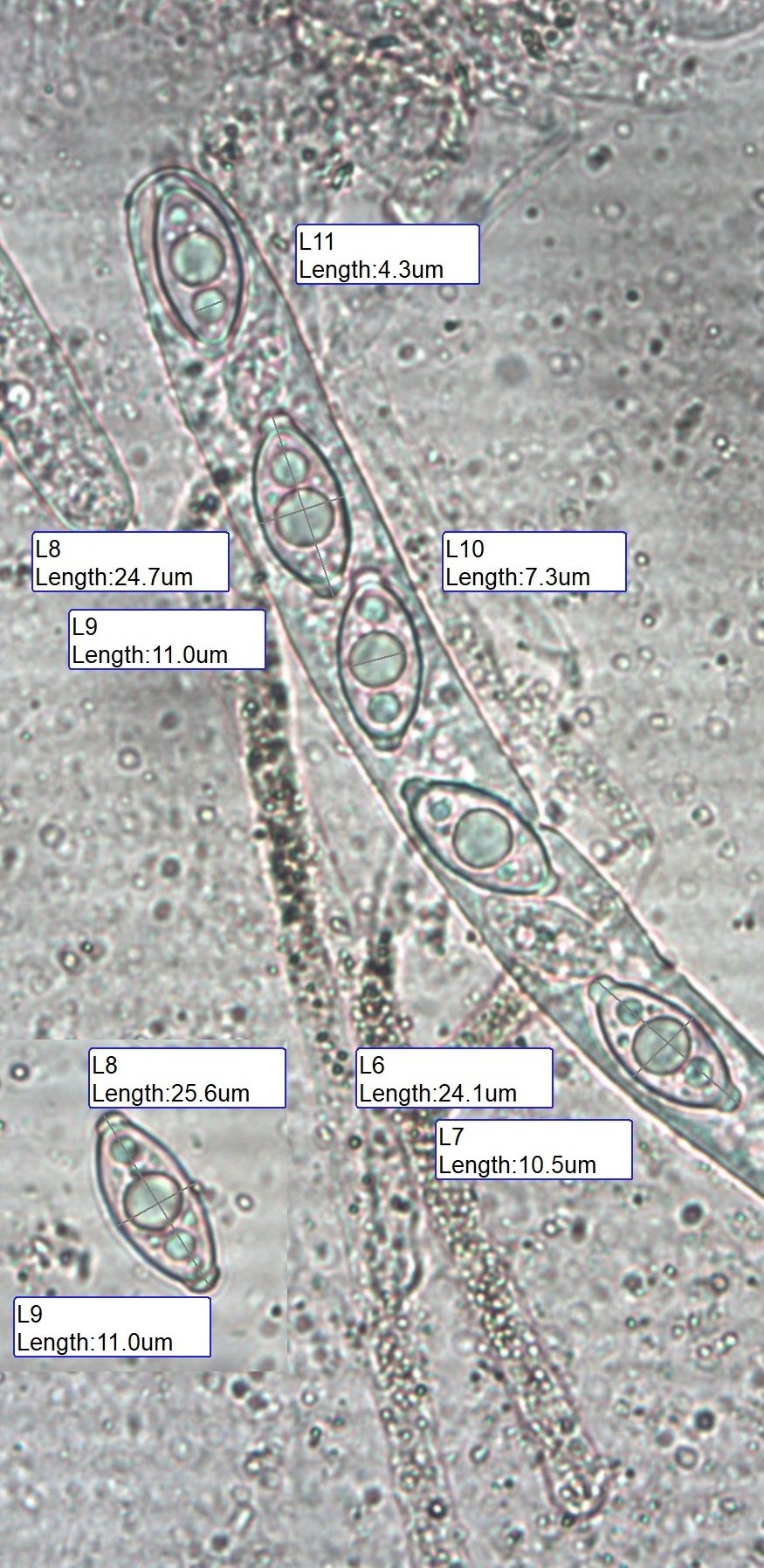 J'attends la visite de Lucian pour écarter définitivement le sosie plus rare ticinianus , pourtant recensé une fois en Loire à 38 km de chez moi à l'écologie un peu différente. La longueur des asques va plutôt dans le sens de gigas.. Ce soir les spores s'allongent un peu et leur profil se rapproche un peu plus de l'espèce envisagée. Q entre 2.2 et 2.5 (hors apicule).