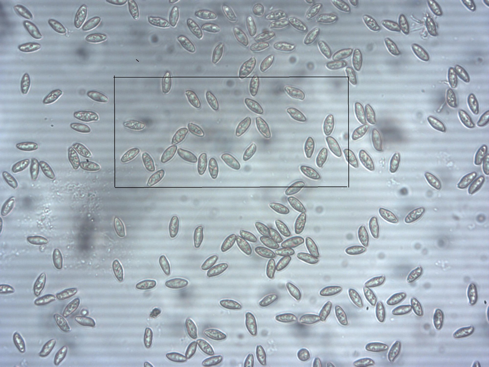 Désolé de ne mesurer que si peu de spores, Fouad, car je fais ça manuellement, une par une. De toute façon, sur cette photo générale, tu constateras que les autres ne sont pas différentes et que le rapport ne devrait pas changer beaucoup. Les tiennes sont légèrement plus petites mais ce n'est pas très significatif, chrysenteron a des spores presque aussi longues que pruinatus et ce n'est pas trop son écologie.