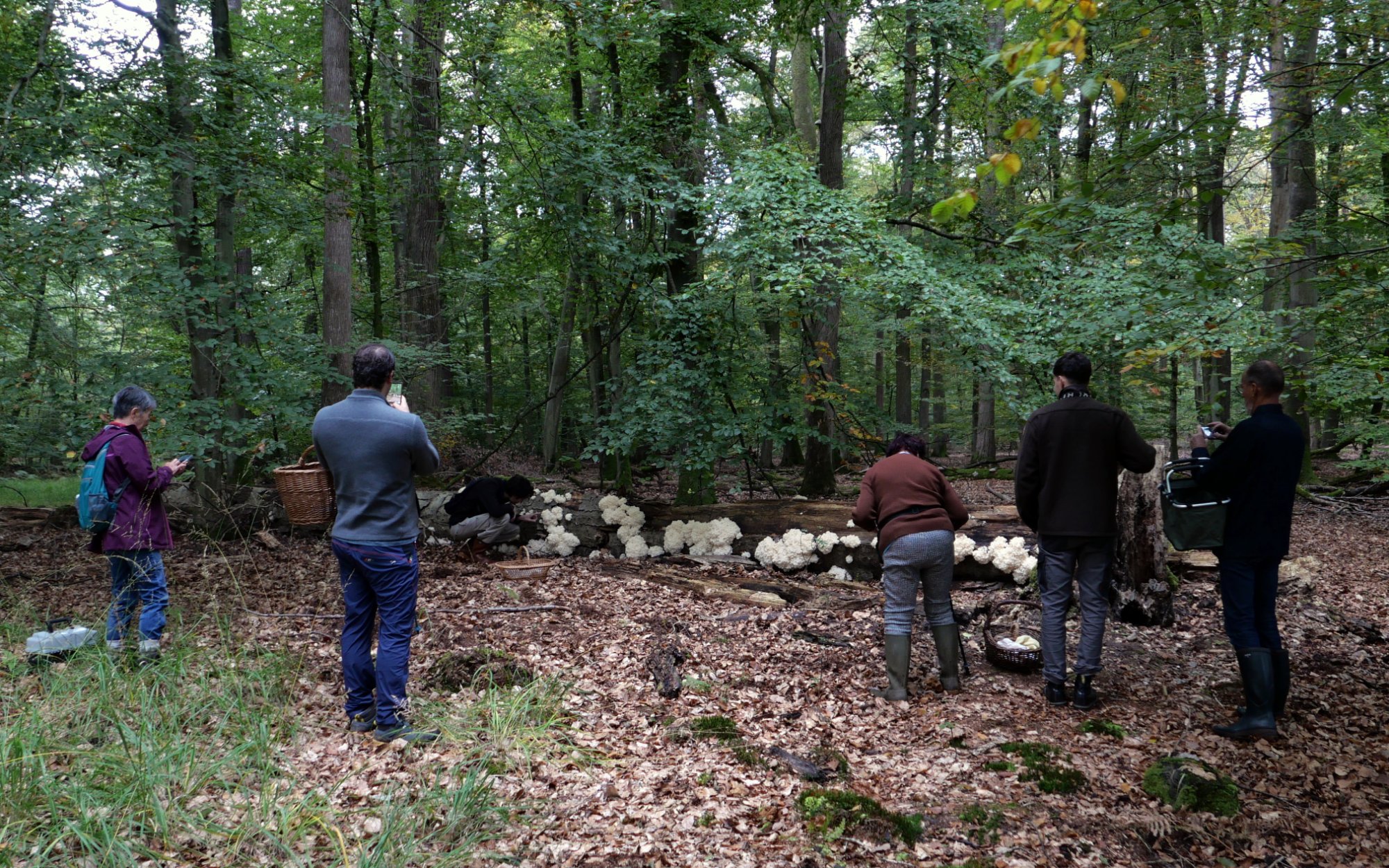 À propos de champignons hydnoïdes lignicoles, Yves parlait hier de deux "premières" le même jour. Pour ceux ci-dessous (session SMF, forêt de Haguenau le 12/10/23), ça a été non seulement une première (et pas que pour moi) mais avec la quasi-certitude que c'était aussi une dernière : j'ai eu l'aubaine d'être là au bon endroit au bon moment, il y a peu de chances que je re-croise cette espèce un jour mais en tous cas jamais comme ça. Comme ces mycologues et comme moi, prenez-en plein les yeux : Jplm