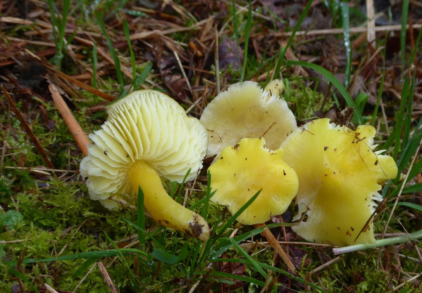 On arrive alors au complexe H. euroflavescens/H.aurantiosplendens. (Le pied n'est pas du tout visqueux, ce qui m'a fait écarté de suite H. chlorophana sur le terrain. D'ailleurs, curieusement, H.euroflavescens et chlorophana sont synonymisés par Mycocharentes).