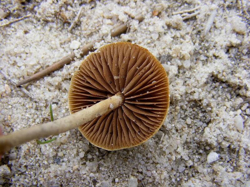 L'année dernière en été, j'avais trouvé ces petits champignons (chapeau --> 3 cm) sur le bord sablonneux d'une piste forestière girondine, parmi quelques rares herbes.