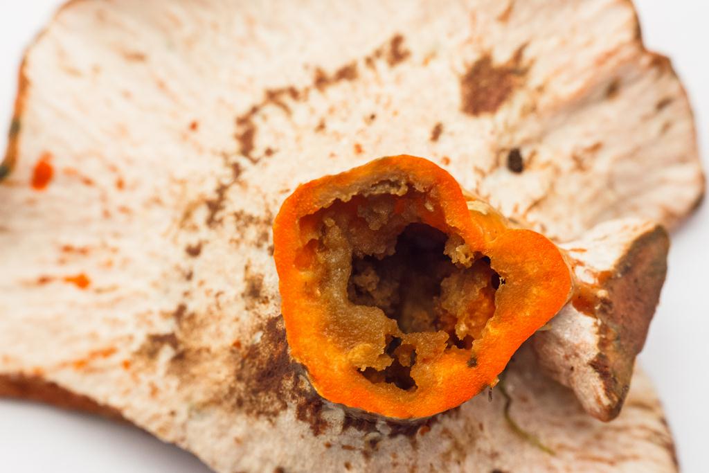 Finalement j'avais pas tout faux en disant "un lactaire aux lames bouffées", sauf que ce n'était pas par un animal et je n'ai pas pensé à un Hypomyces, mais ce parasite semble carrément digérer les lames de sa victime.