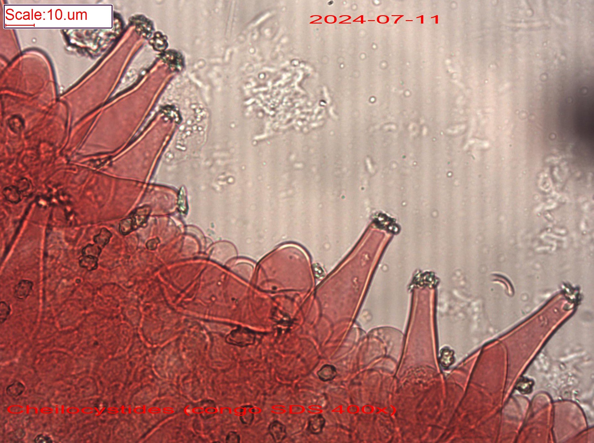 Cheilocystides à cristaux, lagéniformes, fusiformes à base non arrondie, en mélange avec des paracystides utriformes. Parois fines (2 à 3 µ max d'épaisseur) peu réactives à l'ammoniaque.