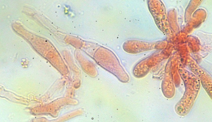 Cystides non métuloïdes, nombreuses de formes plutôt variées.