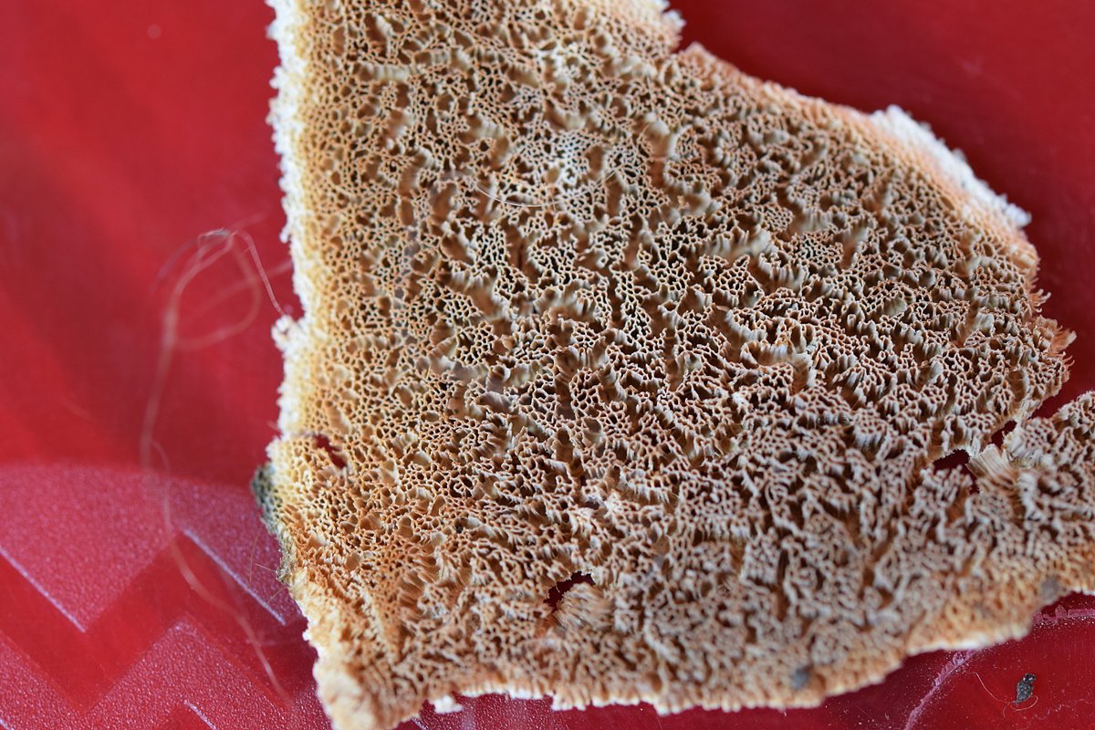 Contrairement au premier, celui-ci exhale une forte odeur fongique. Aussi moins épais, l'hyménium présente cependant parfois de long tubes déchirés comme sur la première photo.