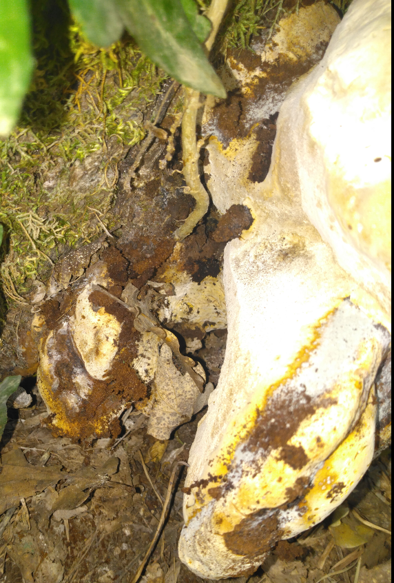 Quant à l'autre champignon à terre, il n'est pas identifiable en l'état. Peut-être un autre Inonotus arraché ou tombé et retourné dos au sol, il faudrait au moins voir l'autre côté... ou l'oublier.
