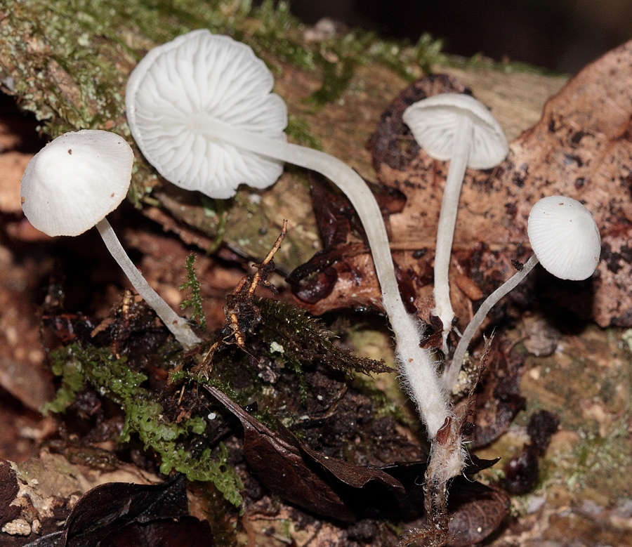 ces petites hemimycena blanches de maxi 15 mm de diamètre.. : pied pruineux à base hirsute, lames adnées