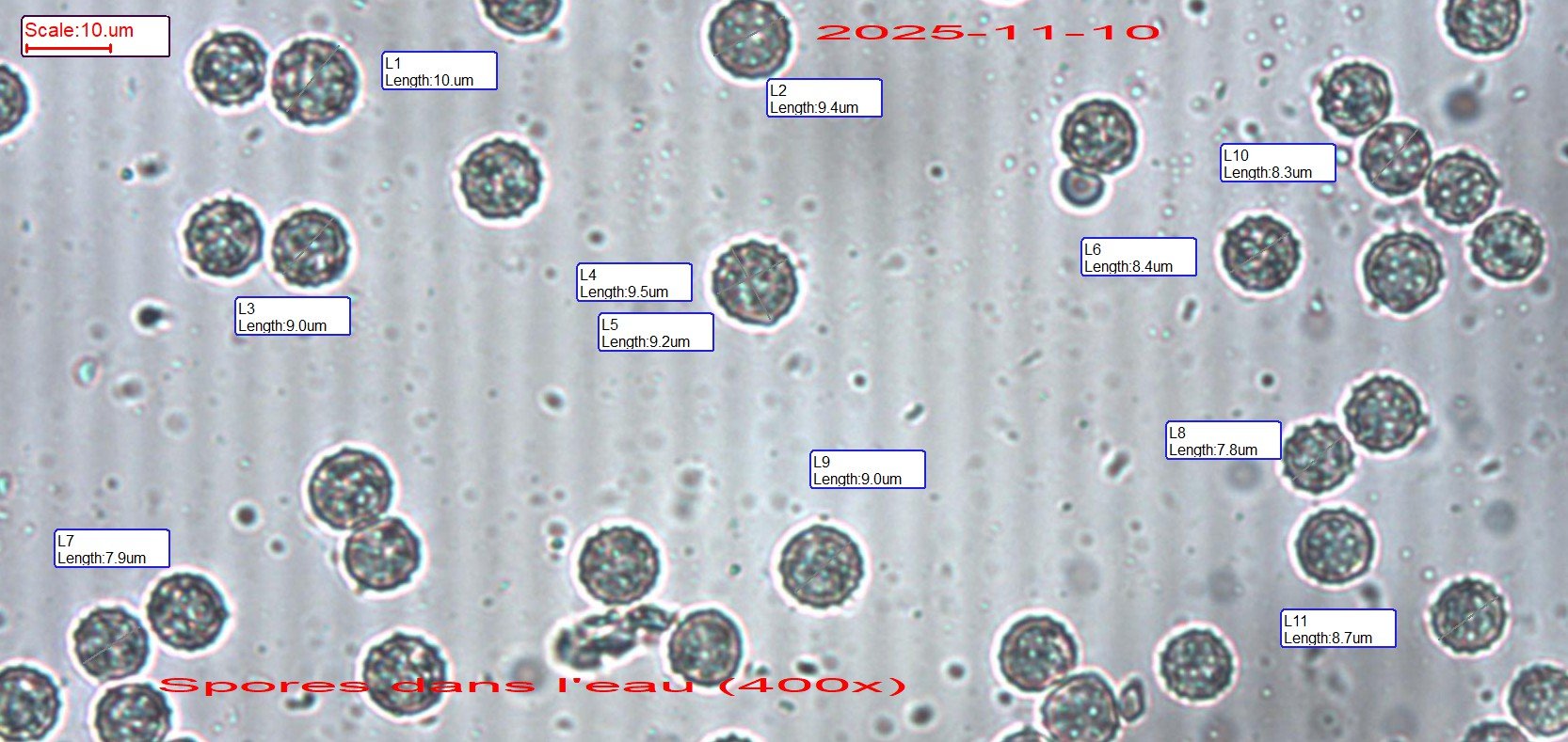 Les spores globuleuses donnent le choix entre Laccaria macrocystidiata et Laccaria affinis avec des dimensions assez proches.
