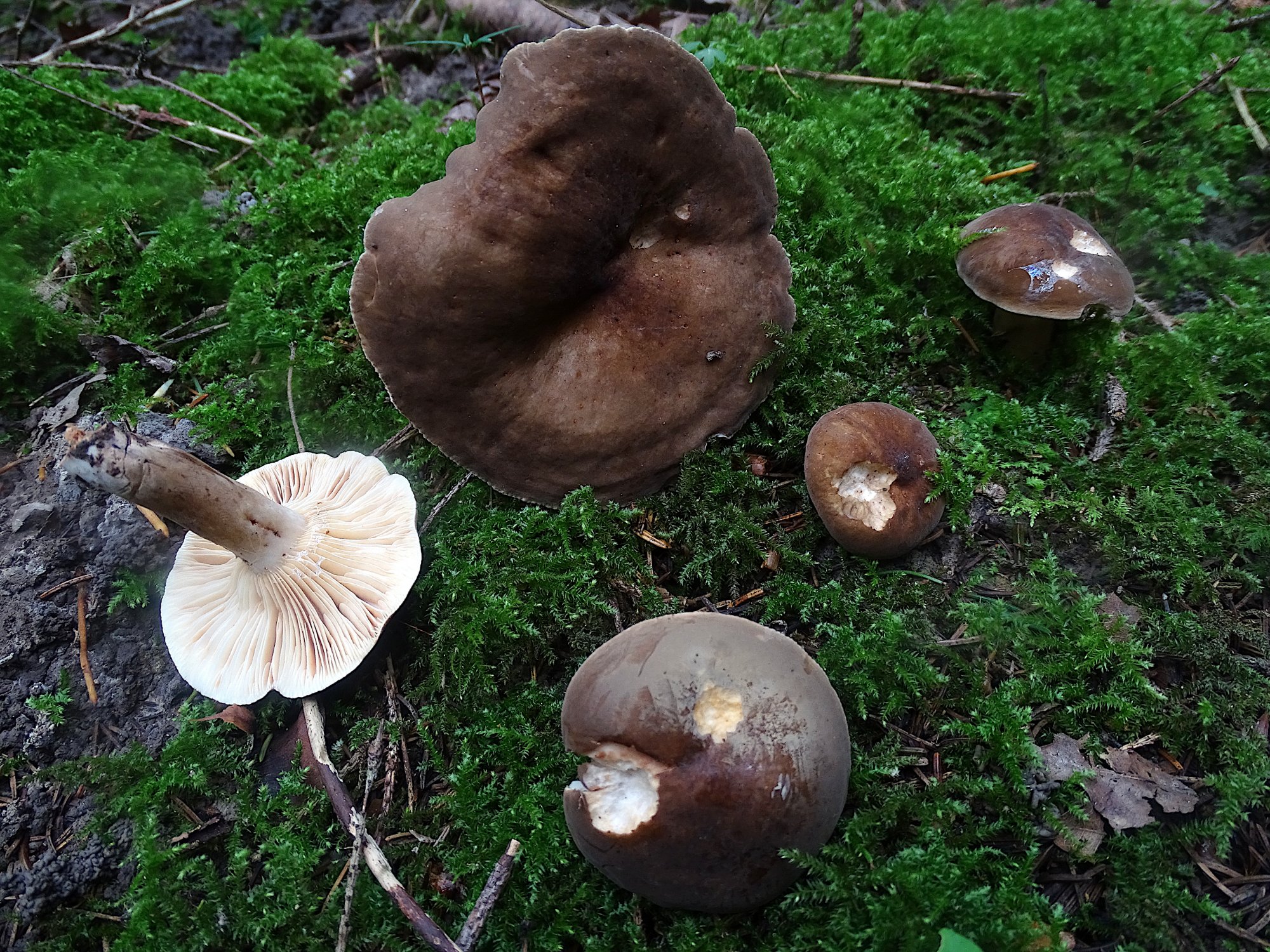Ce groupe de lactaires assez sombres a été trouvé dans une forêt plutôt mêlée, plutôt sous conifères, mais en bordure, je veux dire entre un bosquet d'épicéas et de feuillus (hêtres, chênes, charmes). Chapeau brun chaud, mat et velouté, marge irrégulière, non cannelée. Les jeunes ont un petit mamelon.