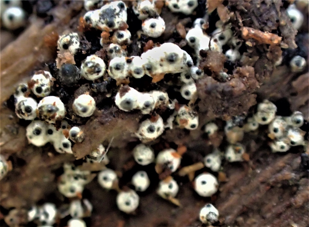 Bravo, vous avez reconnu Lasiophaeria ovina, qui poussait sur une bûche pourrie de mon jardin et j'avais pris dans un premier temps pour un myxo parasité car il faut dire que ces satanés asco ont la fâcheuse habitude de venir manger mes myxos.