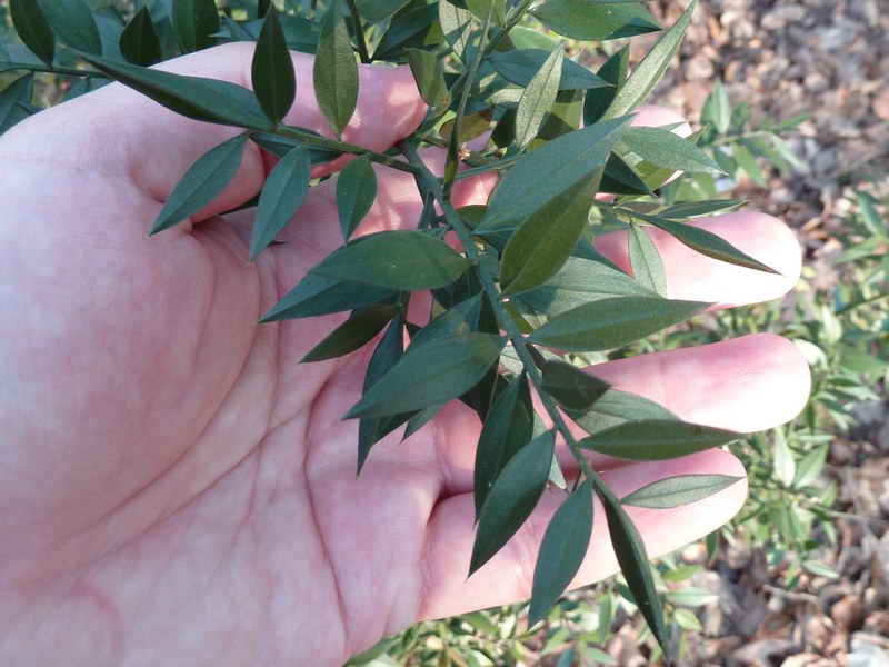 Salut, il s'agit du Fragon (Ruscus aculeatus). Jolies petites fleurs disposées au milieu de rameaux spéciaux appelés «cladodes». Les fruits sont des baies rouges.
