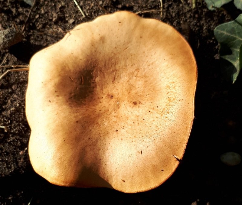Oui, Hygrophoropsis aurantiaca, un exemplaire de grande taille. L'espèce pousse plutôt sous les pins, il n'y en a aucun dans les environs ? Non, la chair n'est pas blanche, elle est jaune orangé pâle.