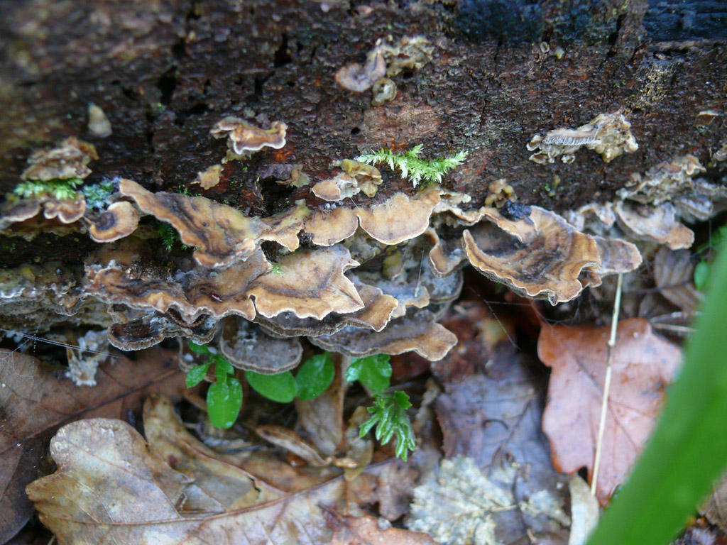 trouvé il ya une semaine dans une foret de feuillus. ces champignons vivant en colonie ne me semble pas étre des stérées en raison des pores visibles sur certains clichés. aprés recherche j'ai pensé a leptoporus adustus...sans être sur.