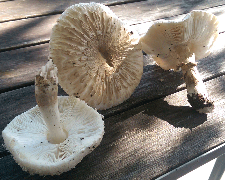 j'ai l'impression qu'il y a deux espèces... Le blanc retourné me fait penser à Leucoagaricus barsii (= L. macrorhizus) dont le bas du pied aurait été cassé. Les deux autres ne m'évoquent pas grand chose...