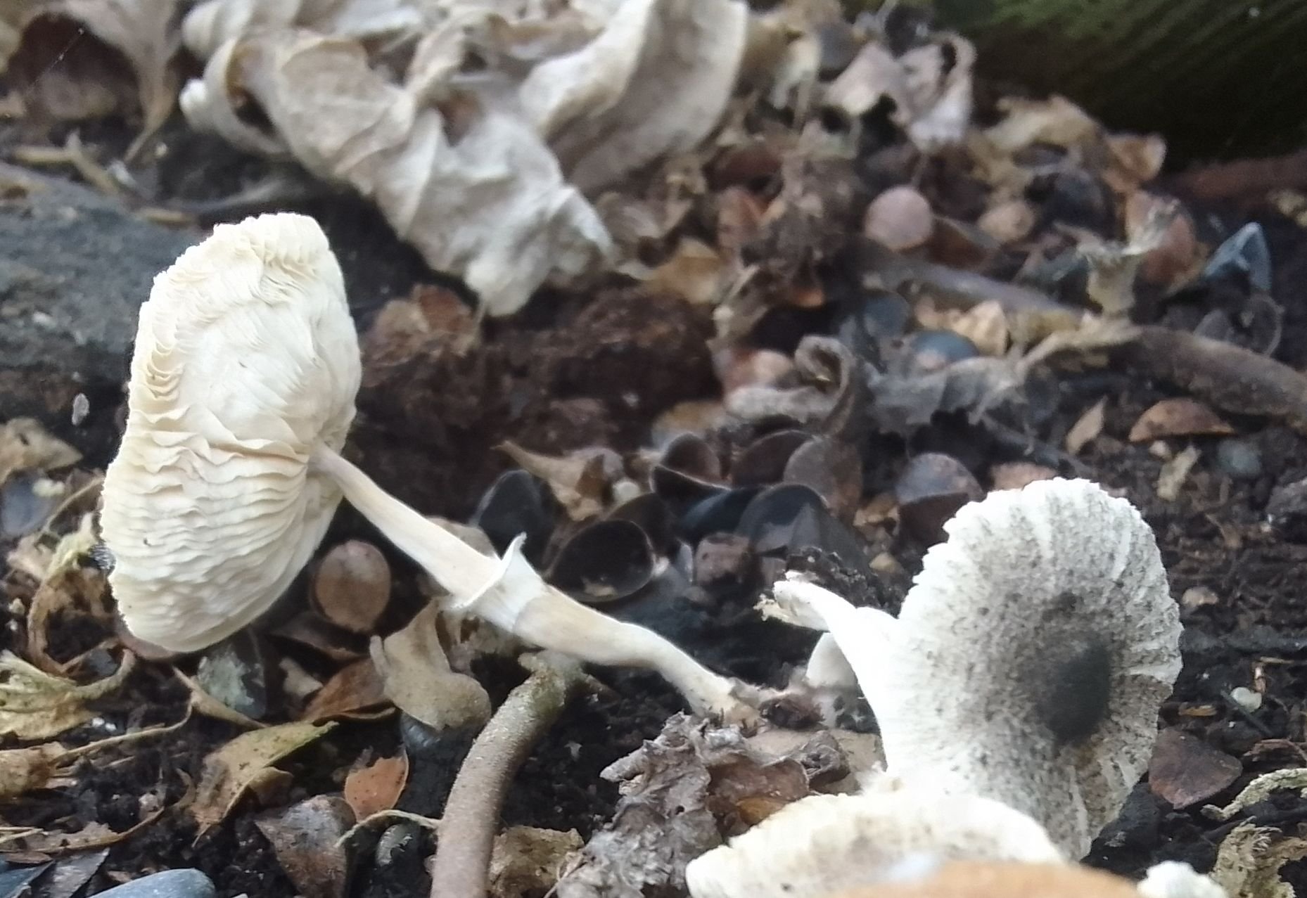 Un autre leucocoprinus. Serre chaude humide constamment accueillant des plantes tropicales. Chapeau 1 cm max. Noir brunatre au centre, méchuleux radialement puis plus fibrilleux grisâtre à la marge sur fond blanc. Port un peu élancé malgré la taille, chapeau s'applanissant. Chair un peu élastique. Anneau bague, en collerette infère.
