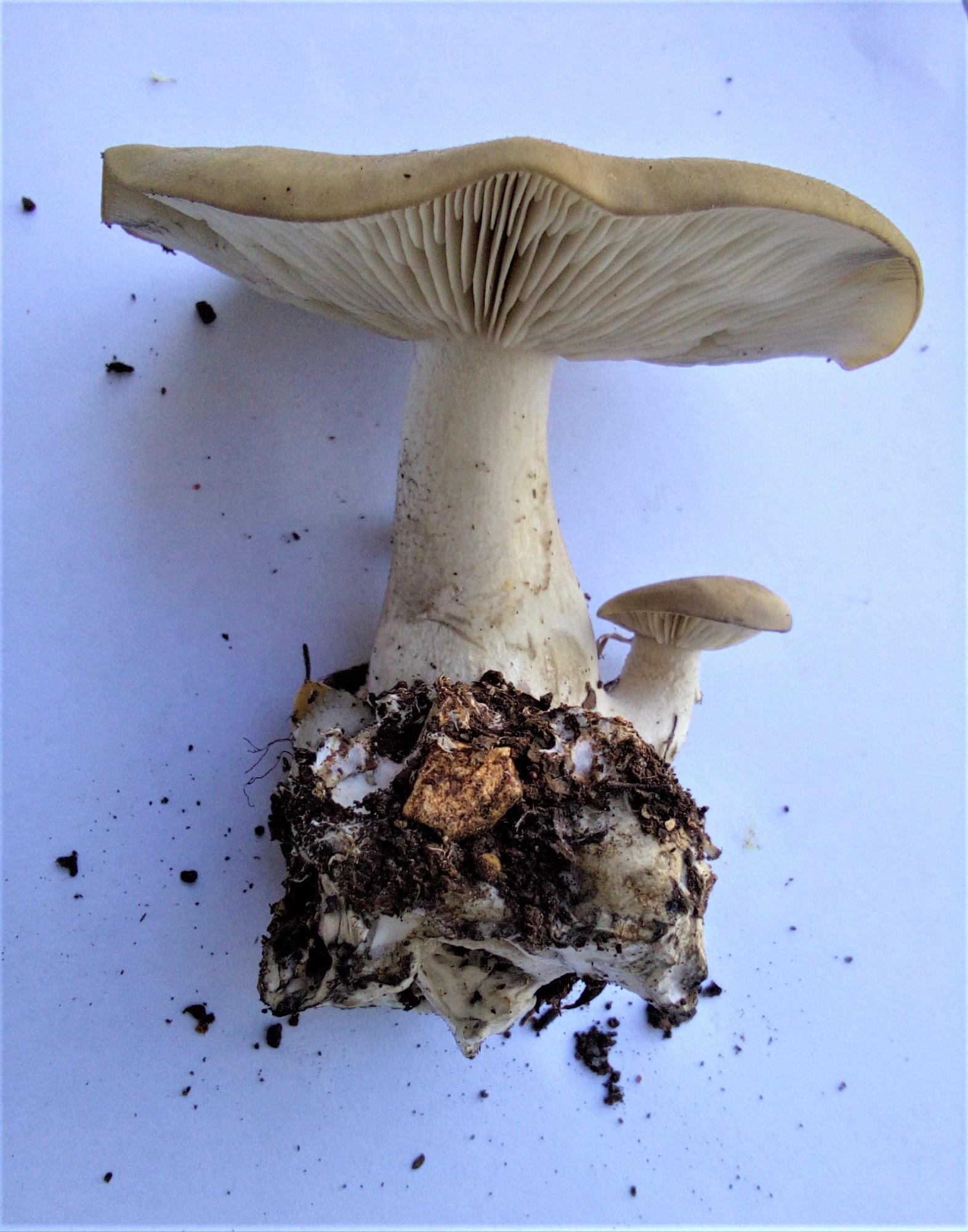 En pleine garrigue (toujours sèche et qui attend la pluie), un Quercus pubescens renfermait un peu d'humidité, assez pour découvrir ce joli champignon très charnu à la base du pied, profond, chapeau gris-brun pâle (plus pâle au centre), odeur faible, sporée blanche.