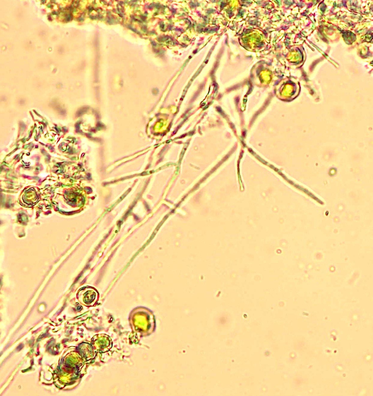 On voit bien une spore en haut à gauche de la deuxième photo, avec plus au centre des cellules d'algues vertes.