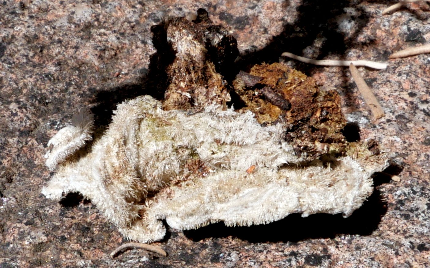 Personne d'autre ne prêtant la moindre attention à cette demande de détermination, j'ai cherché de mon côté : on trouve peu d'images d'A. mesenterica desséchée et extrêmement peu où le champignon forme une plaque continue et non veinée sur le support... mais il y en a. Je renomme donc. Merci Ghislaine de m'avoir remis sur la voie.