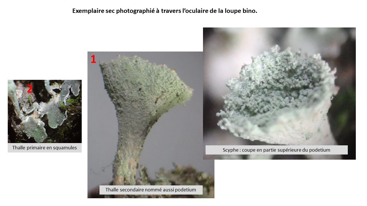Je ne sais pas si tu n'y connais rien aux lichens mais tu as tout de même quelques notions de vocabulaire : scyphes, thalle primaire et secondaire, podetium... C'est comme quand on ne connait rien aux lames et qu'on demande si elles sont collariées, anastomosées, juste émarginées ou bien décurrentes par une dent, avec une arête un peu serrulée et des faces nuageuses !