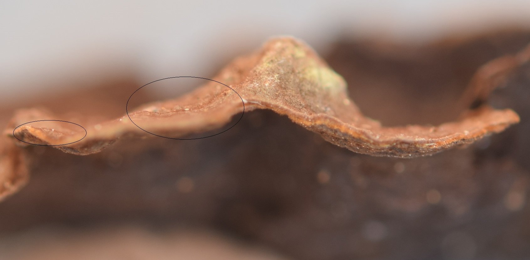 Bien visibles de profil sur le terrain avec une bonne loupe ; On les devine aussi sur la première photo de l'hyménium (à gauche en agrandissant) sous la forme de lignes plus sombres, rousses sur fond plus gris.