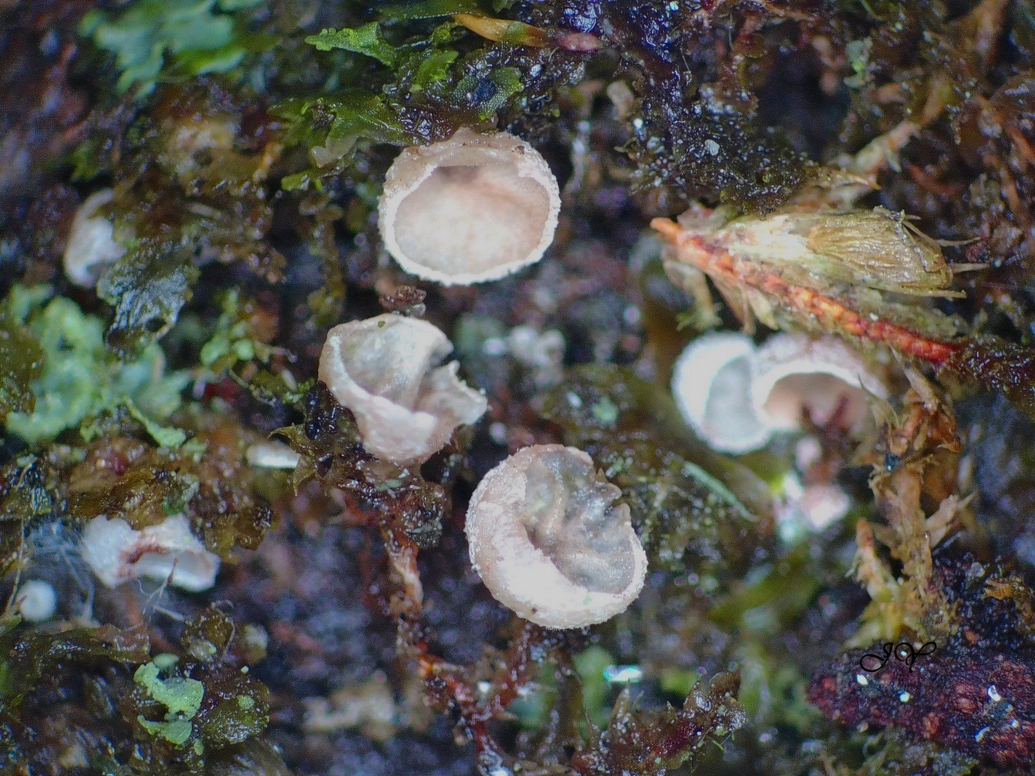 Il s'agit d'une ''cyphelle'', un basidiomycète qui se déguise en ascomycète. Il s'agit de Chromocyphella muscicola, caractérisé par un habitat sur mousses et les spores brunes (normalement, on voit des ponctuations brunes dans l'hymenium, qui est coloré par les spores).