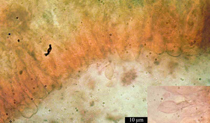 J’ai donc repris un fragment de lamelle que j’ai écrasé sous une lame dans le rouge congo sds : Sur ces deux derniers clichés, j’ai mesuré ce que je prends pour des spores : elles mesurent entre 6,5 et 9 µm…