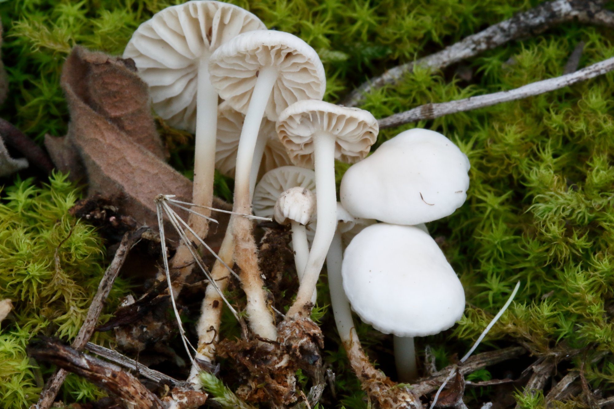 J'ai regardé Mycena, Mycenella, Mycenitis, Marasmius, Marasmiellus, Collybia et plusieurs voisins, je ne vois rien à chapeau blanc, non plissé, lames blanches, échancrées, ventrues et nettement espacées, pied blanc , velu et teinté de brun roux vers le bas, un peu bulbeux ?