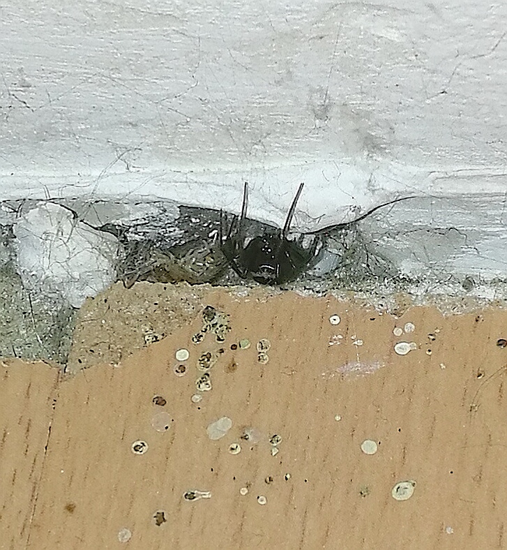Merci d'avance de votre aide, je sais que la photo n'est pas géniale mais je n'ai pas voulu prendre de risque. Ça me soulagerais vraiment de savoir que ça n'est est pas une... or pas mal de signes correspondent (le noir profond, la taille, les pattes, le corps/abdomen, la petite tâche sur le dos, la toile en vrac, etc... Je n'ai pas réussi à voir en dessous de son corps, encore une fois, pas voulu de prendre de risque. Je sais que dans cette région à priori il ne devrait pas y en avoir mais hélas tout arrive de nos jours... surtout sur le déplacement des espèces. Je crois que seul des spécialistes pourront examiner cette photo et en tirer une conclusion.