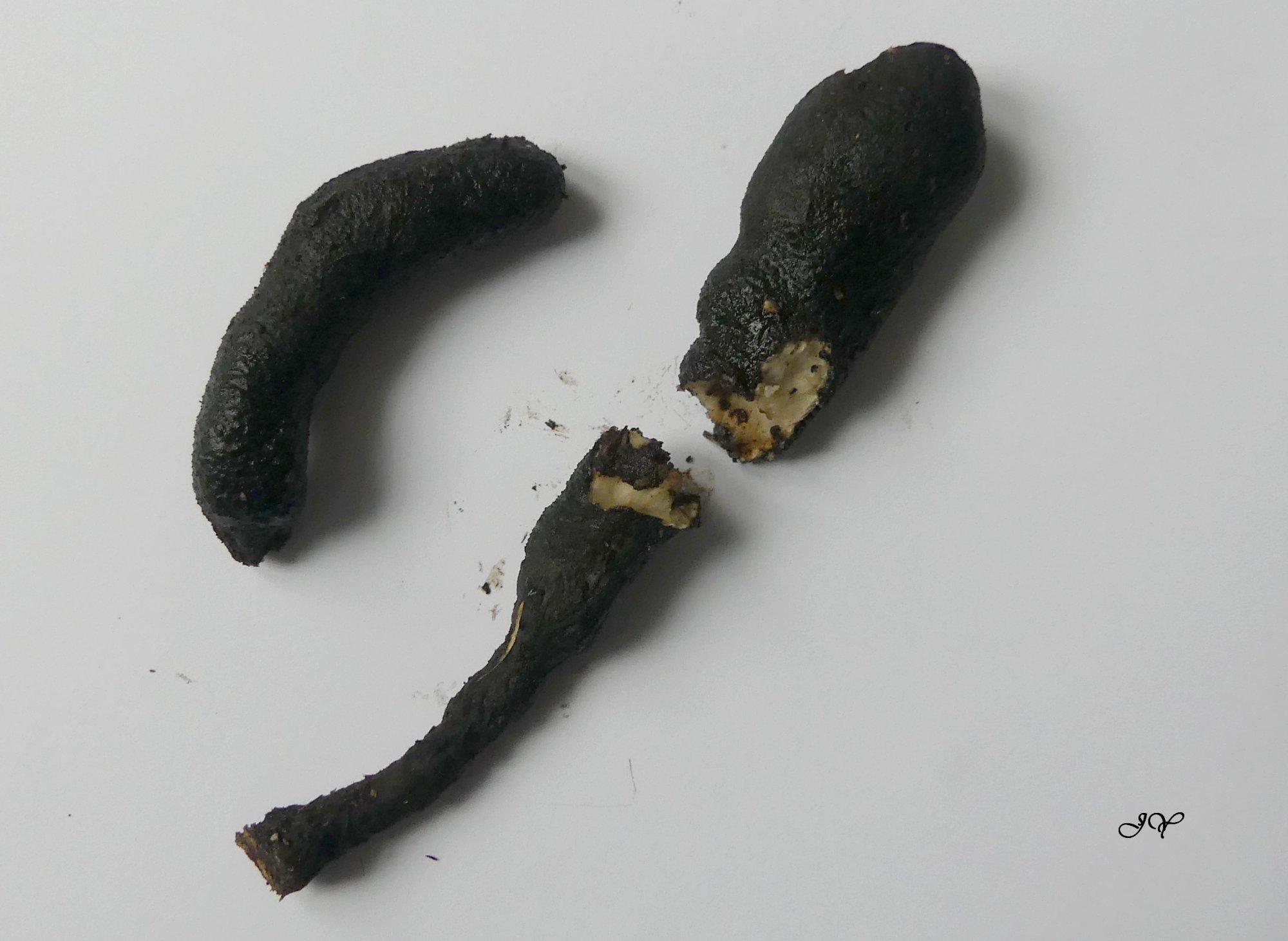 Sur des bûches de chêne en voie de décomposition, juste à côté du tas de bois du dernier sujet, "Hypoxylon - Jackrogersella minutella", je découvre ces champignons noirs. Ils étaient fixés sur le bois. J'hésite entre deux cordyceps.