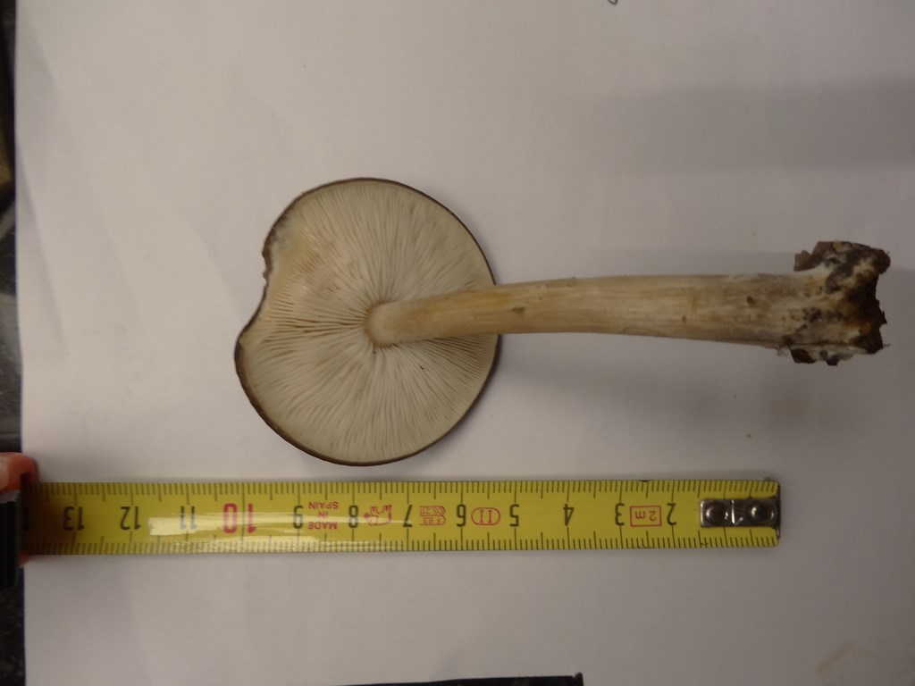 Pied de 8 cm de haut, blanc sous les lames puis beige, fibrilleux, blanc dans le bas du pied au niveau du mycélium. En coupe, fonçant en descendant et brun dans le bas du pied.