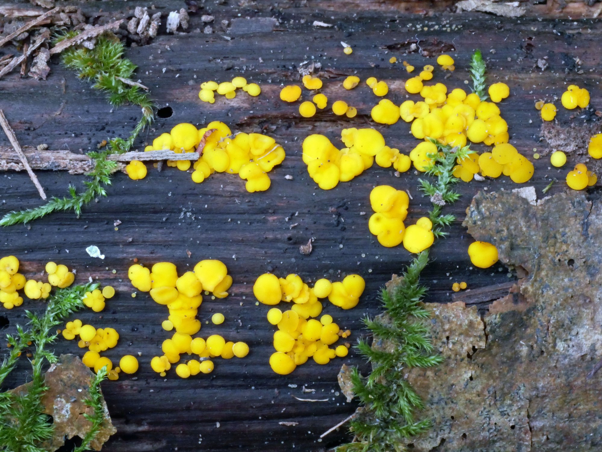 Hyménium et surface externe lisse, jaune citron à jaune d’œuf avec une marge plus foncée.