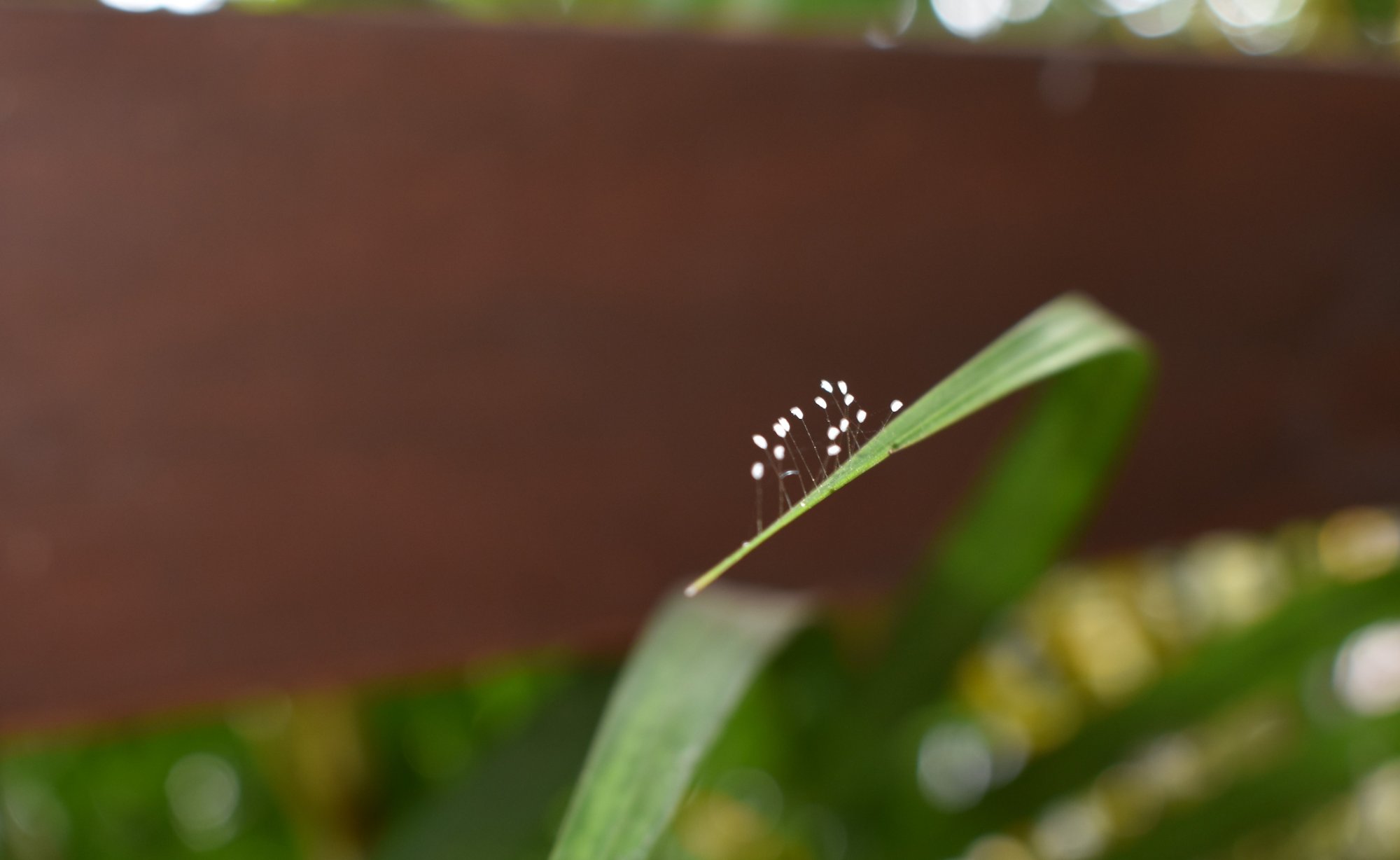 Voir page 61 de ce document L'entomofaune des zones agricoles de Guyane : "Les œufs de chrysopes sont typiques, ovales et blanchâtres, ils sont perchés sur un filament vertical à la face supérieure des feuilles."