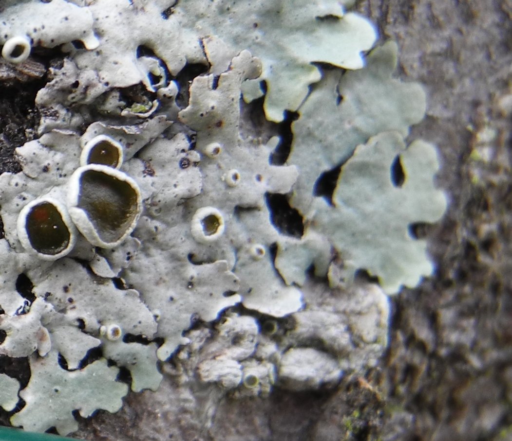 Il ne reste plus que Physcia biziana puisque lui seul verdit quand il est hydraté ... même si je n'ai pas vu de pruine sur la surface du thalle.
