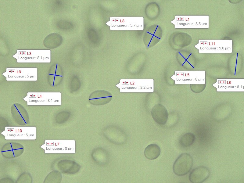 Les spores sont elliptiques de dimension autour de 8-8.5 x 5-6 µm.