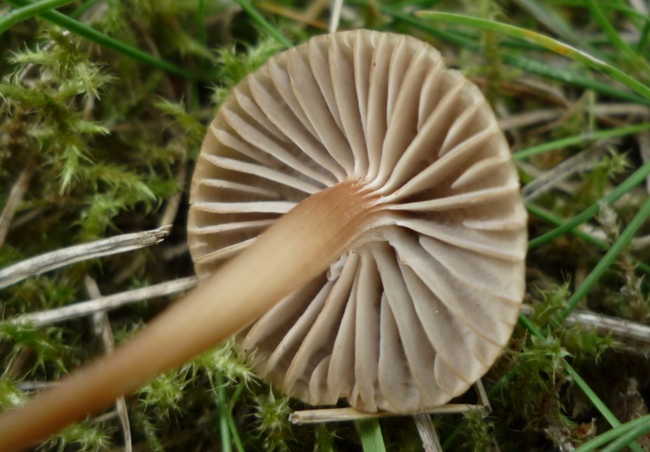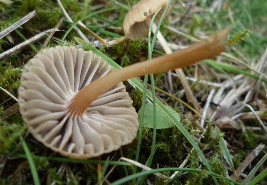 Sur gazon moussu en verger, deux exemplaires. Chapeau non mesuré, environ 1.5/2 cm pour le plus gros. Cannelé. Les lames sont assez espacées, décurrentes et laisse percevoir une couleur grise. Je me demande s'il n'y a pas un peu d'olivacé sur l'arête. La sporée est blanche. La saveur douce. Odeur présente pas très forte et difficile à définir, pas loin de ce que j'appelle pain mouillé (pas fruitée, pas terreuse, pas farineuse).