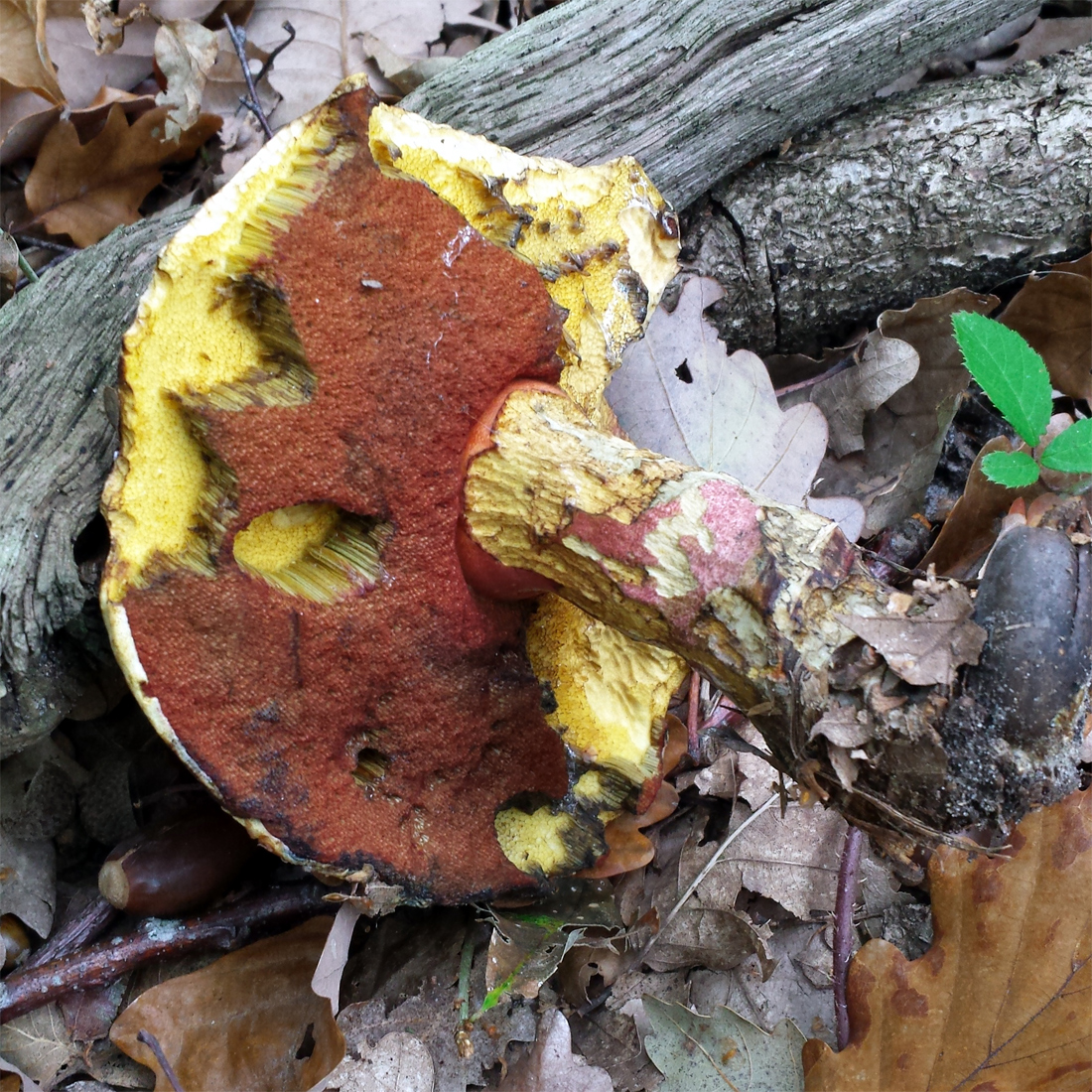 Le champignon, trouvé par Yoko que certains d'entre vous connaissent, était en piteux état, heureusement les limaces avaient épargné les tubes et un ou deux cm2 de la surface du pied qui nous ont permis de l'identifier sans trop d'hésitation :