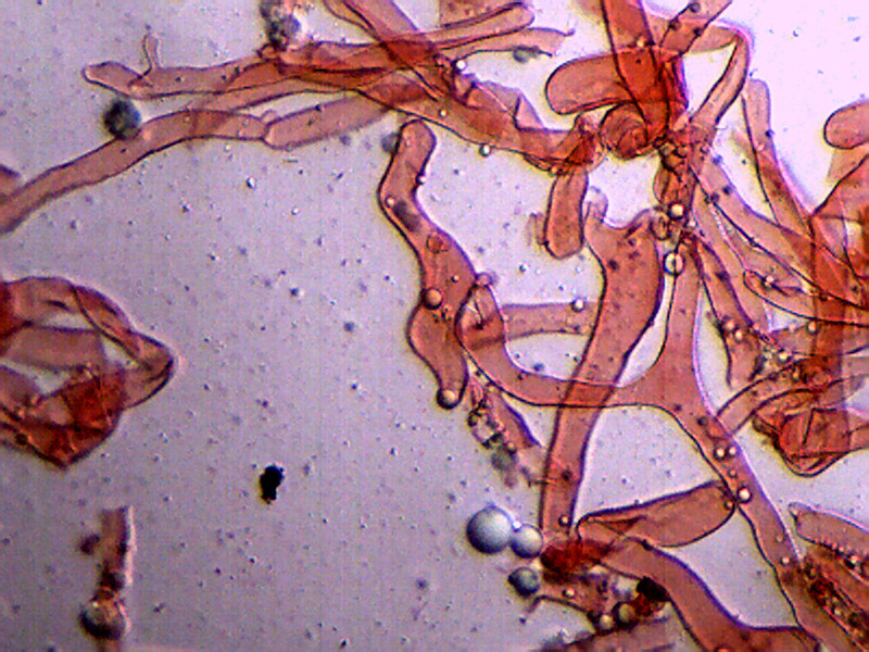 Je reviens sur ce sarcodon. Voici une photo des hyphes, avec au moins une boucle sinon deux visibles.