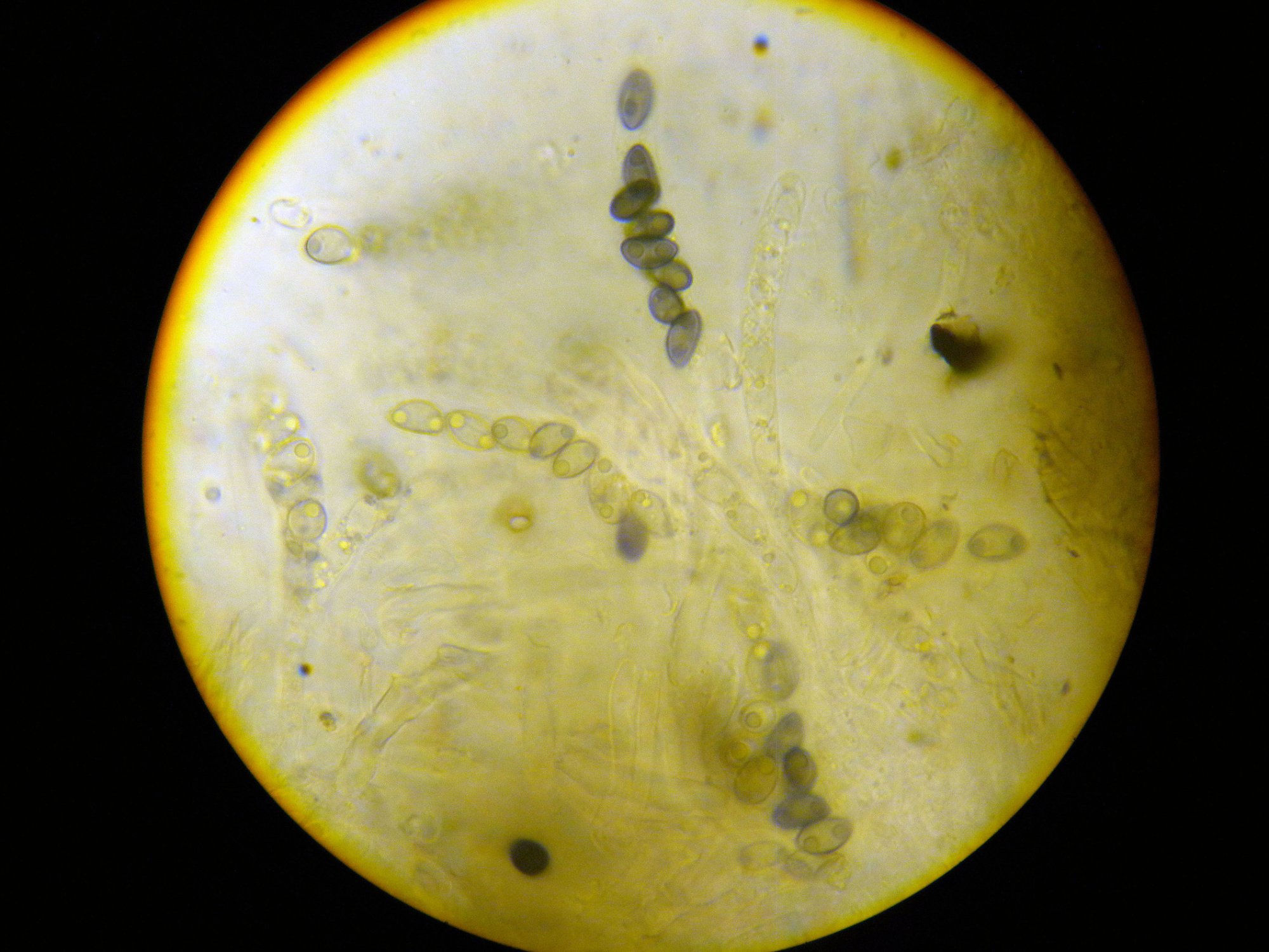 Ci-joint les premières spores extraites de ce polypore en attendant qu'il veuille bien sporuler de lui même sur des lames, je ne sais pas si c'est une meilleure manière que le grattage ?